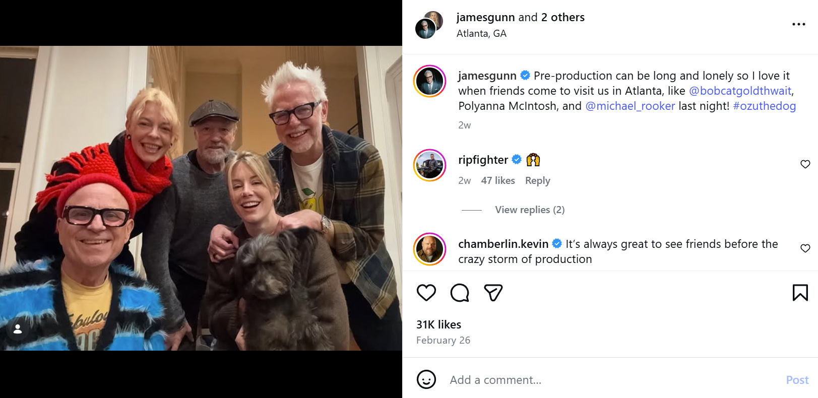 Gunn shared that the film was in pre-production in Georgia at the end of February, “Pre-production can be long and lonely so I love it when friends come to visit us in Atlanta like Bobcat Goldthwait, Polyanna McIntosh, and Michael Rooker last night.