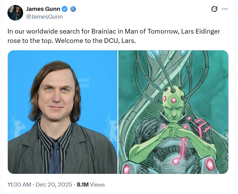 Gunn wrote on X, “In our worldwide search for Brainiac in Man of Tomorrow, Lars Eidinger rose to the top. Welcome to the DCU, Lars.”