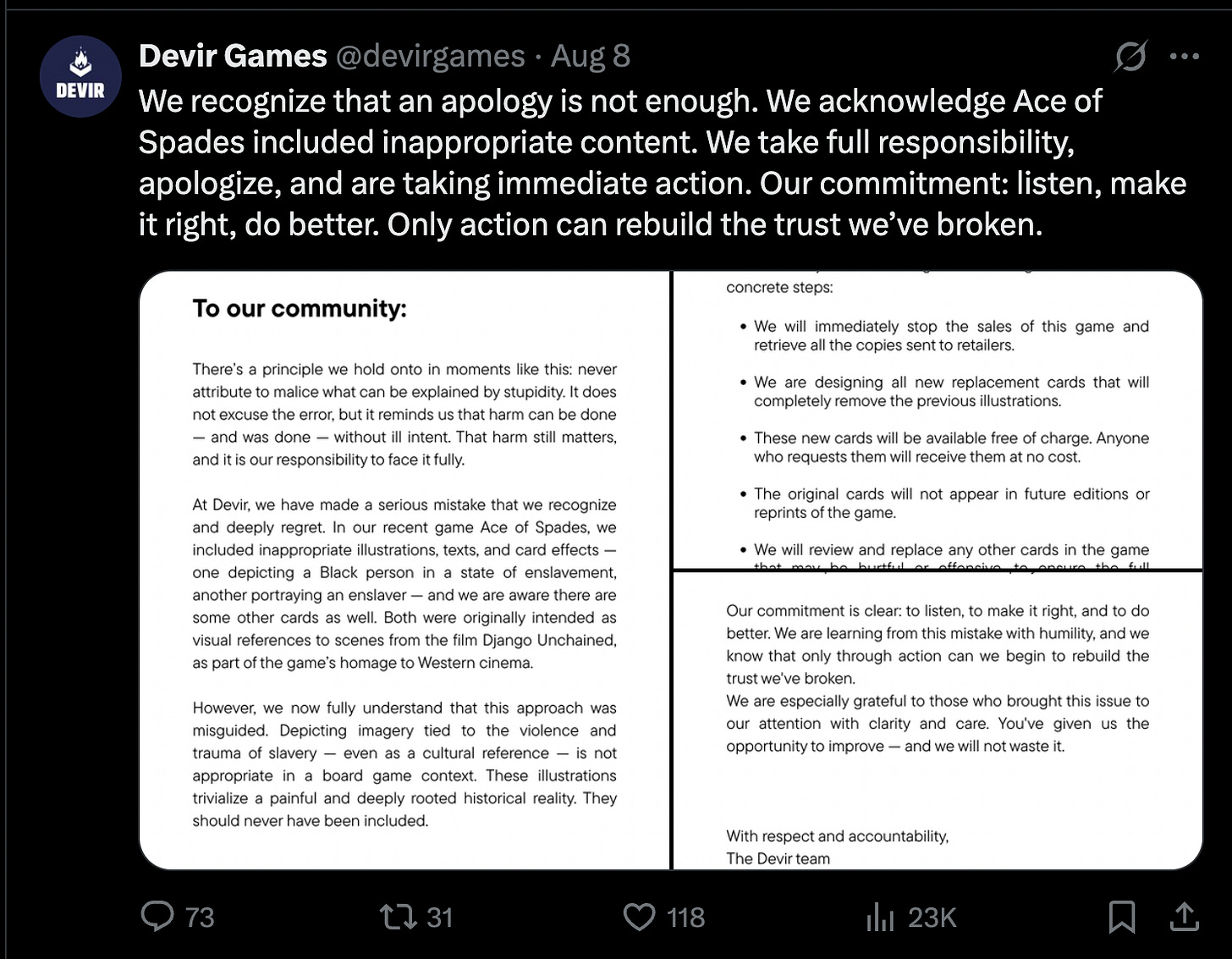 At Devir, we have made a serious mistake that we recognize and deeply regret. In our recent game Ace of Spades, we included inappropriate illustrations, texts, and card effects — one depicting a Black person in a state of enslavement, another portraying an enslaver — and we are aware there are some other cards as well. Both were originally intended as visual references to scenes from the film Django Unchained, as part of the game's homage to Western cinema.