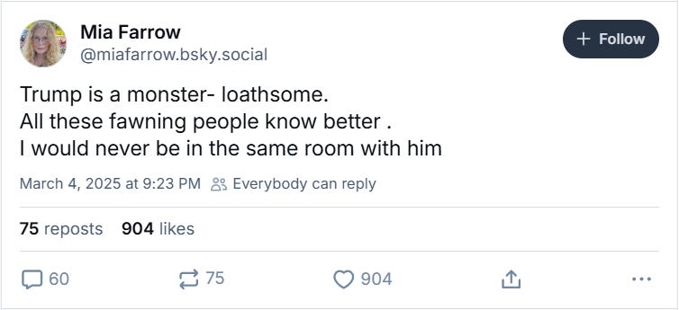 In another post, she added, “Trump is a monster- loathsome. All these fawning people know better . I would never be in the same room with him.”