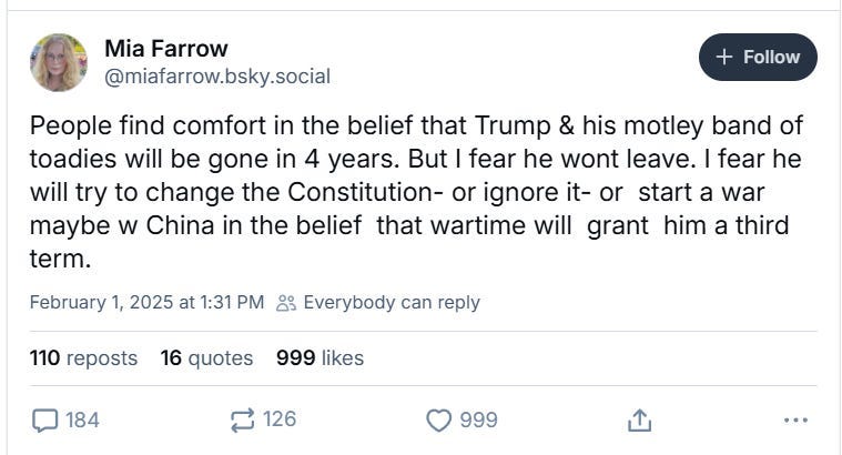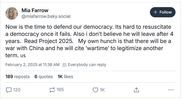 She doubled down on this theory a day later, “Now is the time to defend our democracy. Its hard to resuscitate a democracy once it fails. Also i don’t believe he will leave after 4 years. Read Project 2025. My own hunch is that there will be a war with China and he will cite ‘wartime’ to legitimize another term.”