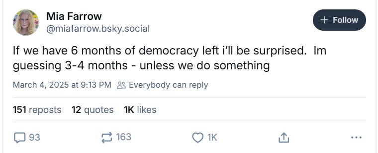 Actress Mia Farrow predicted that the United States only has “3-4 months of democracy left — unless we do something.”