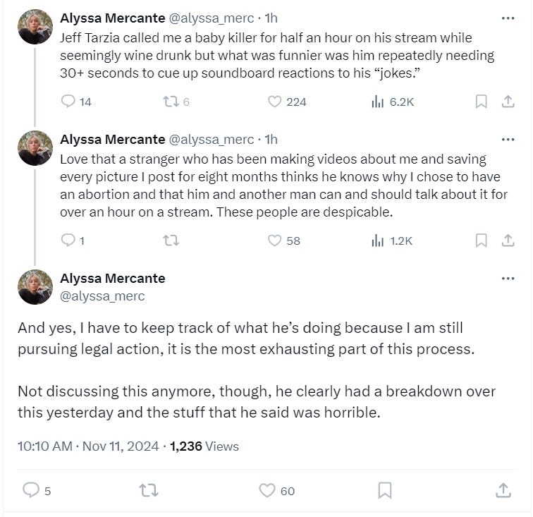 In a thread on X, Mercante wrote, “Jeff Tarzia called me a baby killer for half an hour on his stream while seemingly wine drunk but what was funnier was him repeatedly needing 30+ seconds to cue up soundboard reactions to his ‘jokes.’”