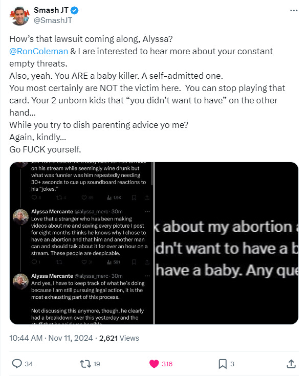Smash JT responded to Mercante’s claims that she was still pursuing legal writing on X, “How’s that lawsuit coming along, Alyssa? Ron Coleman & I are interested to hear more about your constant empty threats.”