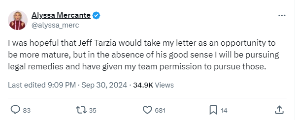 Mercante responded writing on X, “I was hopeful that Jeff Tarzia would take my letter as an opportunity to be more mature, but in the absence of his good sense I will be pursuing legal remedies and have given my team permission to pursue those.”