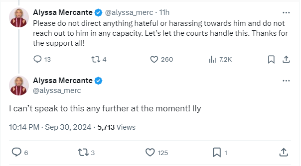 In subsequent posts, she added, “Please do not direct anything hateful or harassing towards him and do not reach out to him in any capacity. Let’s let the courts handle this. Thanks for the support all!”