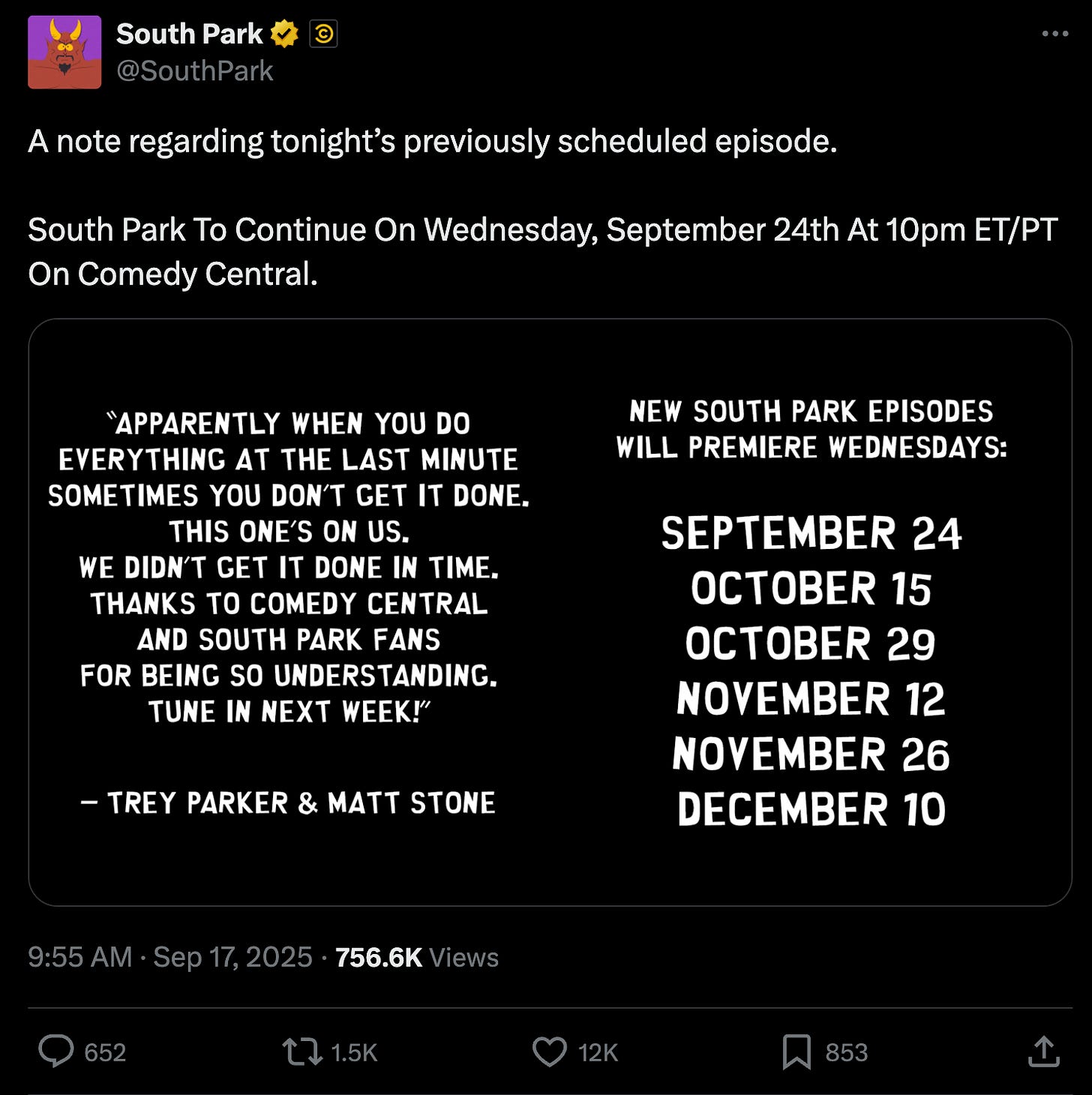 This morning, they made a quick announcement about their show, “Apparently when you do everything at the last minute sometimes you don’t get it done. This one’s on us. We didn’t get it done in time. Thanks to Comedy Central and South Park fans for being so understanding. Tune in next week!”