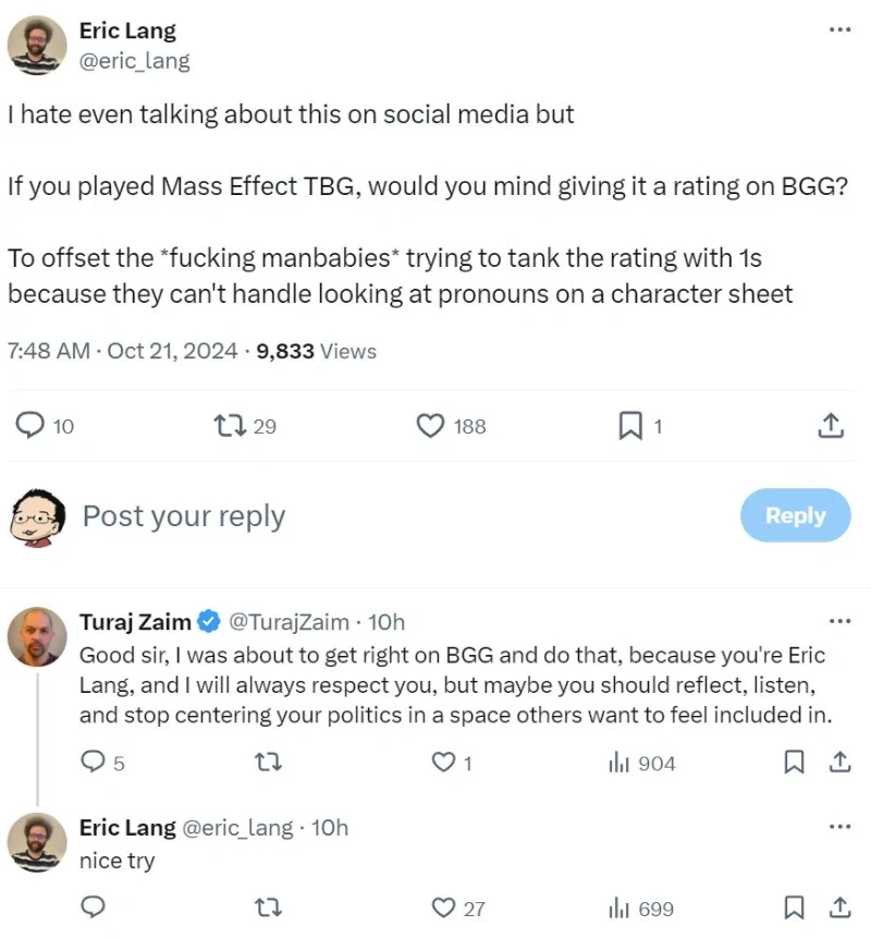 What do you think of Eric Lang flouncing to BlueSky after getting destroyed with Mass Effect: Board Game pronouns? Leave a comment and let us know.