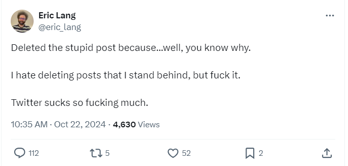 Eric Lang remained on X as he had a big account and apparently couldn’t survive without the dopamine hits it offered from his following.