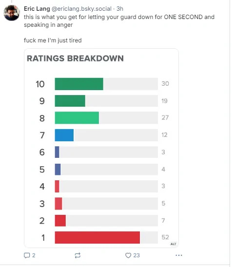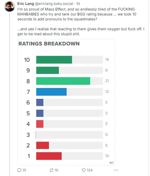 While he deleted the post on X, he did not delete one on Blue Sky expressing the same sentiment. He wrote, “I’m so proud of Mass Effect, and so endlessly tired of the F***ING MANBABIES who try and tank our BGG rating because … we took 10 seconds to add pronouns to the squadmates?”