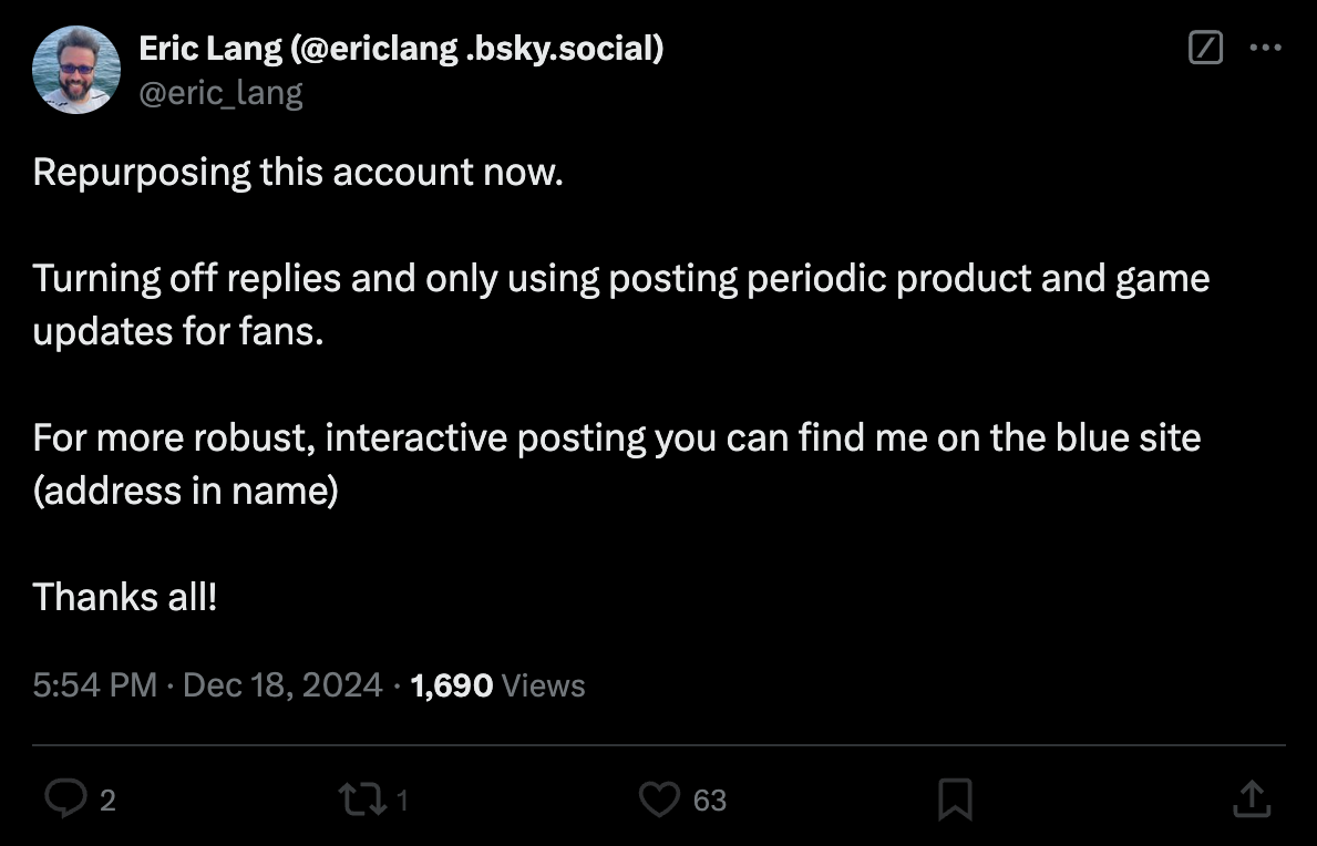 He posted, “Repurposing this account now. Turning off replies and only using posting periodic product and game updates for fans. For more robust, interactive posting you can find me on the blue site (address in name) Thanks all!”