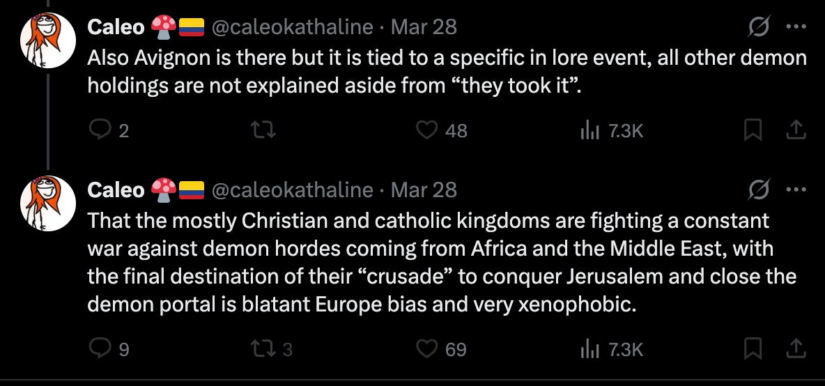 “That the mostly Christian and catholic kingdoms are fighting a constant war against demon hordes coming from Africa and the Middle East, with the final destination of their “crusade” to conquer Jerusalem and close the demon portal is blatant Europe bias and very xenophobic,,” she concluded.