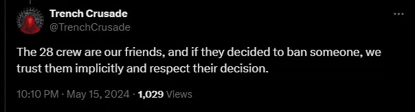 Trench Crusade’s official X account posted defending this action, “The 28 crew are our friends, and if they decided to ban someone, we trust them implicitly and respect their decision.”