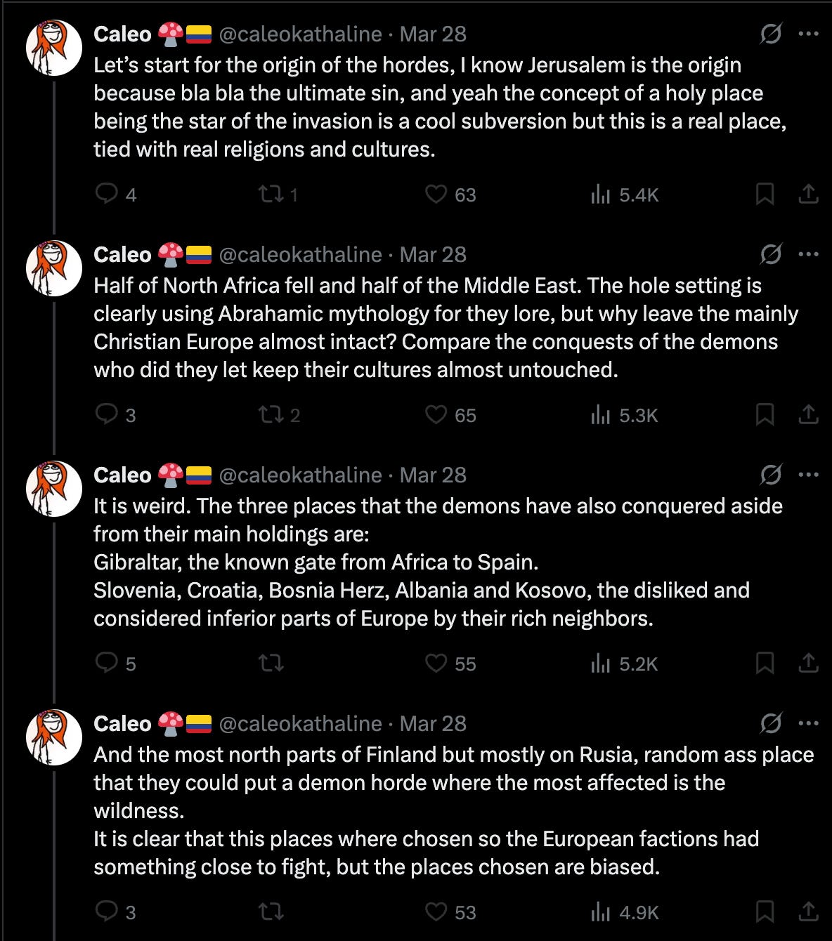 “Let’s start for the origin of the hordes, I know Jerusalem is the origin because bla bla the ultimate sin, and yeah the concept of a holy place being the star of the invasion is a cool subversion but this is a real place, tied with real religions and cultures.”