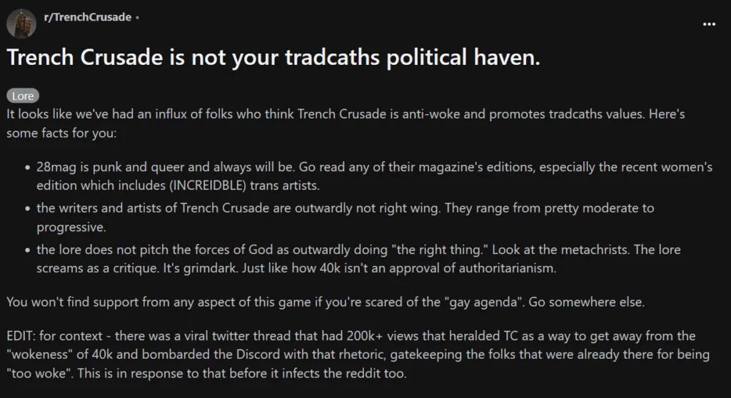 Why they explicitly attacked Catholics and told players they’re not welcome based on their religion seems to be their want to push into identity politics. The post continues saying,“It looks like we’ve had an influx of folks who thinks Trench Crusade is anti-woke and promotes tradcaths values. Here’s some facts for you: