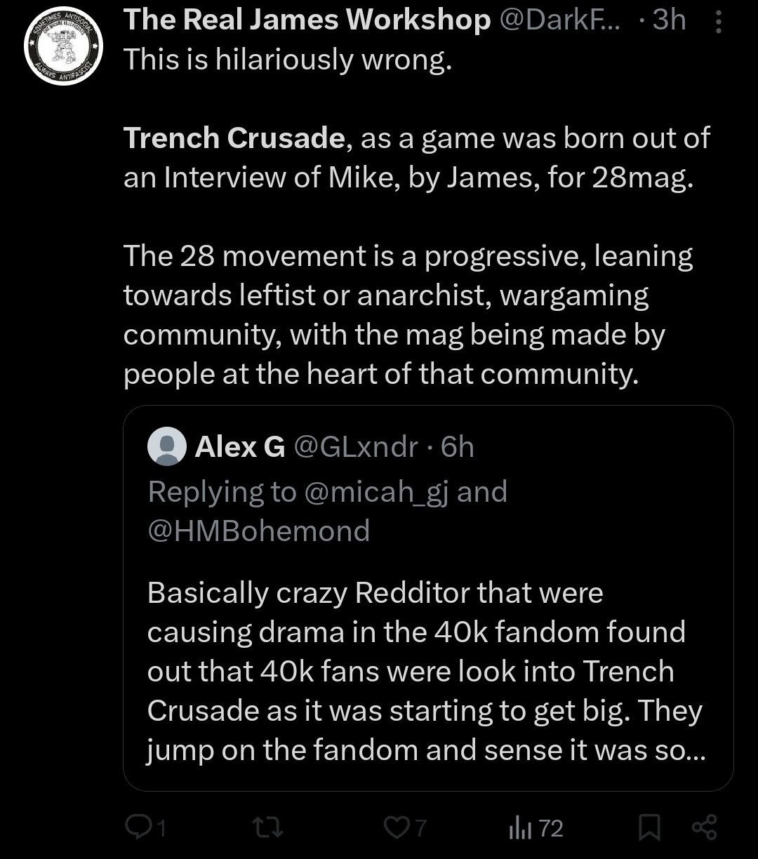 Recently, a fan talked about the history of how Trench Crusade attacked fans fleeing the wokeness of Warhammer 40K, to which a leftist miniatures influencer admitted it’s all about inserting leftism into the game. @DarkForestPress posted, “This is hilariously wrong. Trench Crusade, as a game was born out of an Interview of Mike, by James, for 28mag. The 28 movement is a progressive, leaning towards leftist or anarchist, wargaming community, with the mag being made by people at the heart of that community.”