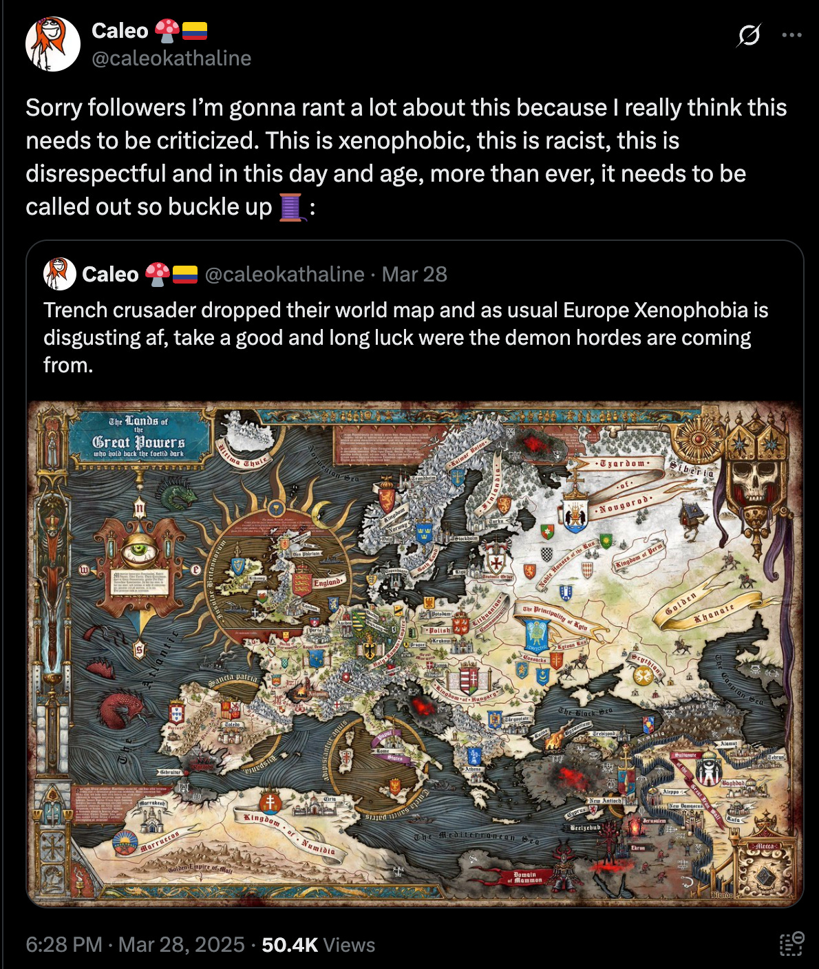 Well, what do you expect? The poor confused Trench Crusade staff are happy with their woke policies, have moderators kick people out of their fora for "misgendering" and similar non-existent nonsense, so why would this be surprising? You live by the sword, you die by the sword. Let them steam in the filth they've helped create for their game.