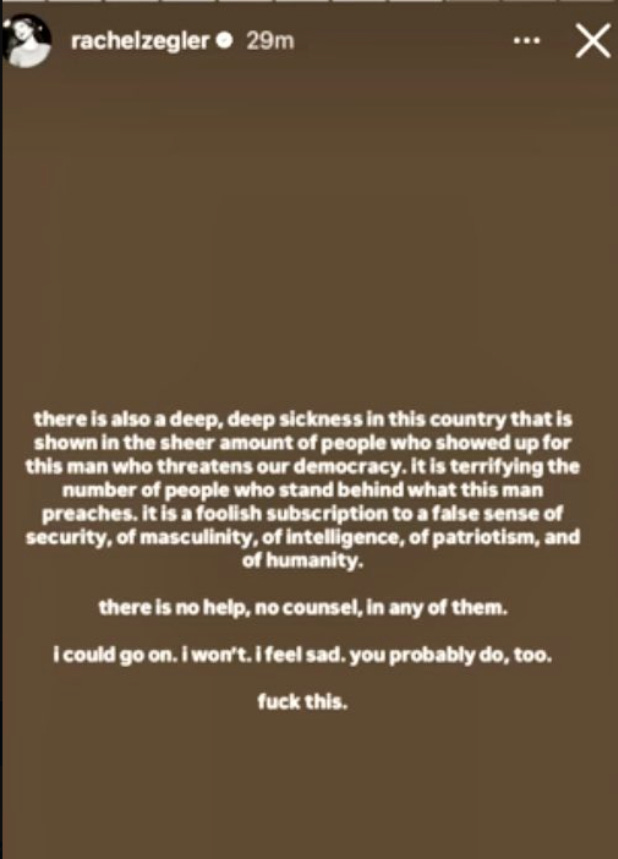 In another post, Zegler wrote, “there is also a deep, deep sickness in this country that is shown in the sheer amount of people who showed up for this man who threatens our democracy. it is terrifying the number of people who stand behind what this man preaches. it is a foolish subscription to a false sense of security, of masculinity, of intelligence, of patriotism, and of humanity.”