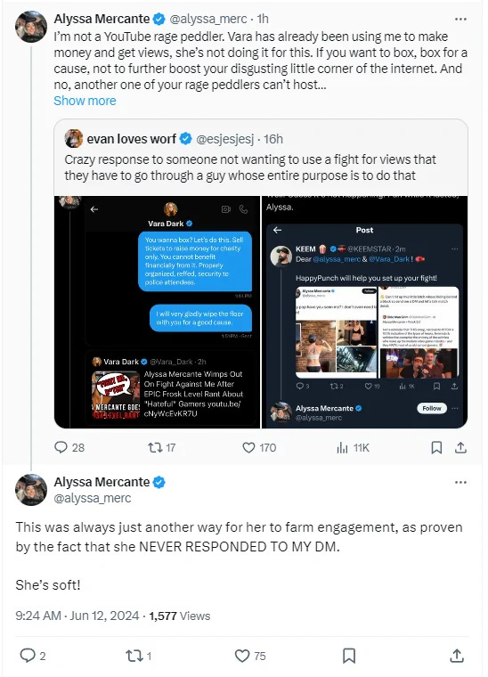 Mercante did not accept any of the challenges and specifically explained why she would not fight Vara Dark, “I’m not a YouTube rage peddler. Vara has already been using me to make money and get views, she’s not doing it for this. If you want to box, box for a cause, not to further boost your disgusting little corner of the internet. And no, another one of your rage peddlers can’t host it either. I’ll fight her in a gym anywhere. This isn’t about clout it’s about what’s right. I’d cross that girl up faster than she can make a thumbnail with my latest selfie.”