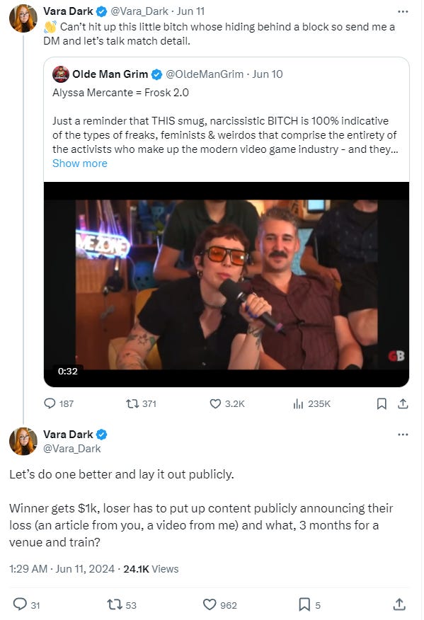 She added, “Let’s do one better and lay it out publicly. Winner gets $1k, loser has to put up content publicly announcing their loss (an article from you, a video from me) and what, 3 months for a venue and train?”