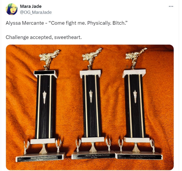 YouTuber Mara Jade simply wrote, “Challenge accepted, sweetheart” while sharing three trophies for first place in Judo competitions.
