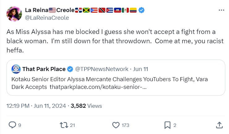 La Reina Creole also wrote, “As Miss Alyssa has me blocked I guess she won’t accept a fight from a black woman. I’m still down for that throwdown. Come at me, you racist heffa.”