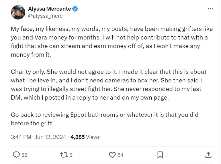 She would double down on why she refused to fight, “My face, my likeness, my words, my posts, have been making grifters like you and Vara money for months. I will not help contribute to that with a fight that she can stream and earn money off of, as I won’t make any money from it.”