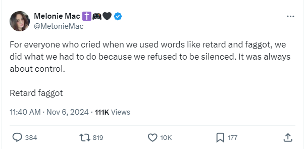 Mac posted on X, “For everyone who cried when we used worlds like retard and faggot, we did what we had to do because we refused to be silenced. It was always about control. Retard faggot.”