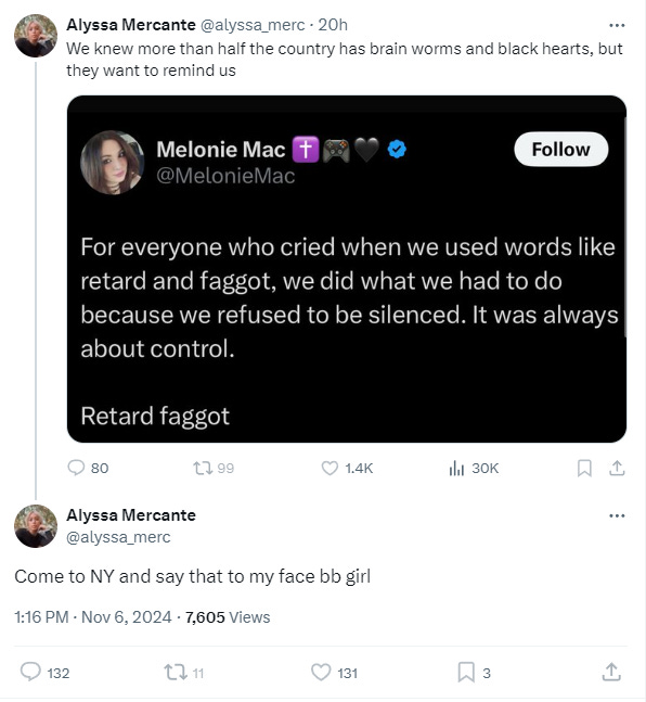 Mercante responded to Mac writing, “We knew more than half the country has brain worms and black hearts, but they want to remind us.”