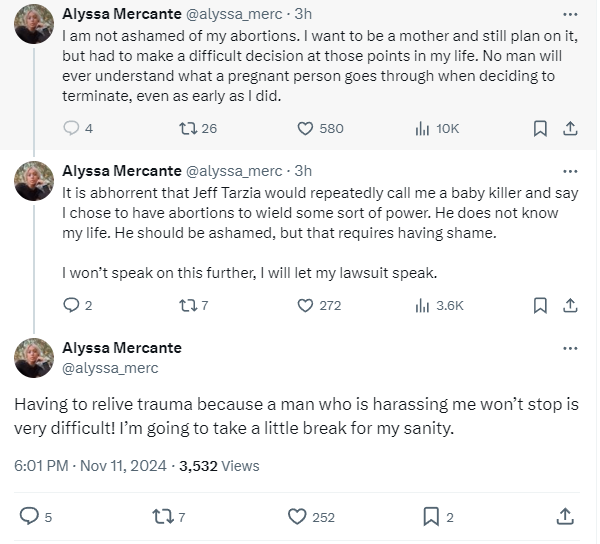 She followed up, “It is abhorrent that Jeff Tarzia would repeatedly call me a baby killer and say I chose to have abortions to wield some sort of power. He does not know my life. He should be ashamed, but that requires having shame. I won’t speak on this further, I will let my lawsuit speak.’