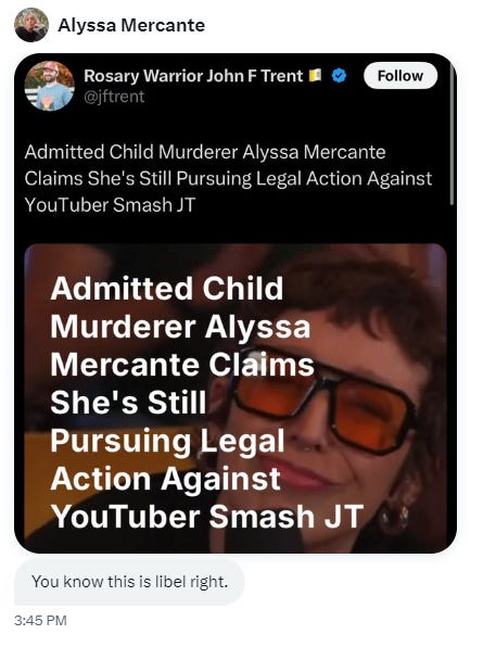 John Trent took a screenshot of the DM, posting, “Alyssa Mercante tries to claim the truth is libel. The truth cannot be libel,” and posting the DM along with two screenshots where Alyssa Mercante confirmed she had abortions.