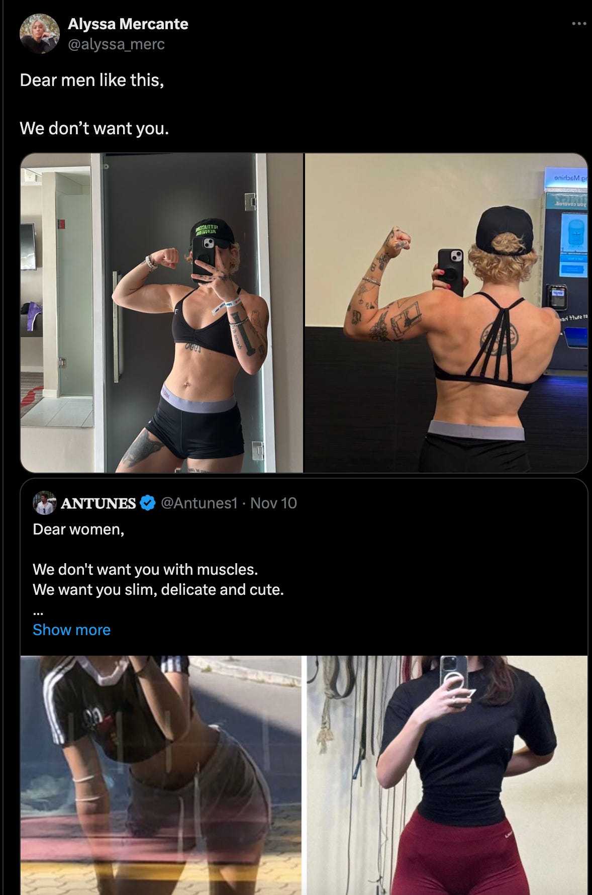 Despite saying this, she continued to goad and attack men on her timeline just hours later, stating, “Dear men like this, We don’t want you,” along with pictures of herself in gym attire.