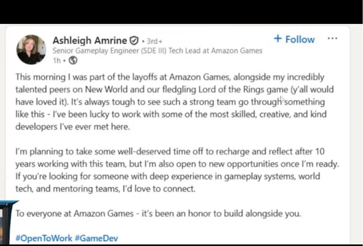 However, as part of the approximately 14,000 people that were laid off across Amazon including its games division this week, former Senior Gameplay Engineer and Tech Lead Ashleigh Amrine indicated the game was getting scrapped. She wrote on LinkedIn, “This morning I was part of the layoffs at Amazon Games, alongside my incredibly talented peers on New World and our fledgling Lord of the Rings game (y’all would have loved it). It’s always tough to see such a strong team go through something like this - I’ve been lucky to work with some of the most skilled, creative, and kind developers I’ve ever met here.”