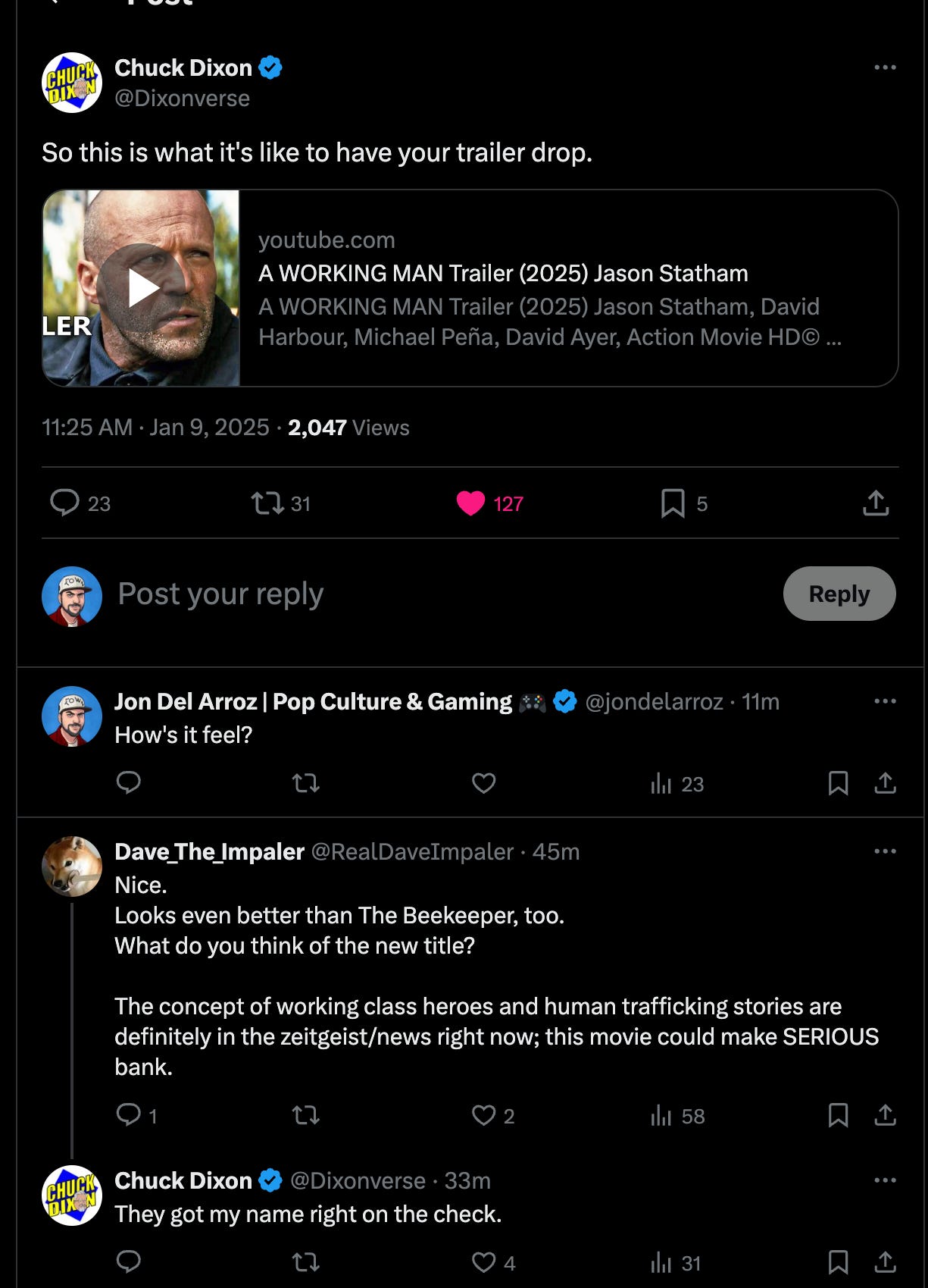 Chuck Dixon has had success with his Levon Cade novels for a long time, and now he gets to see them made into a feature film with Jason Statham playing the character in A Working Man.
