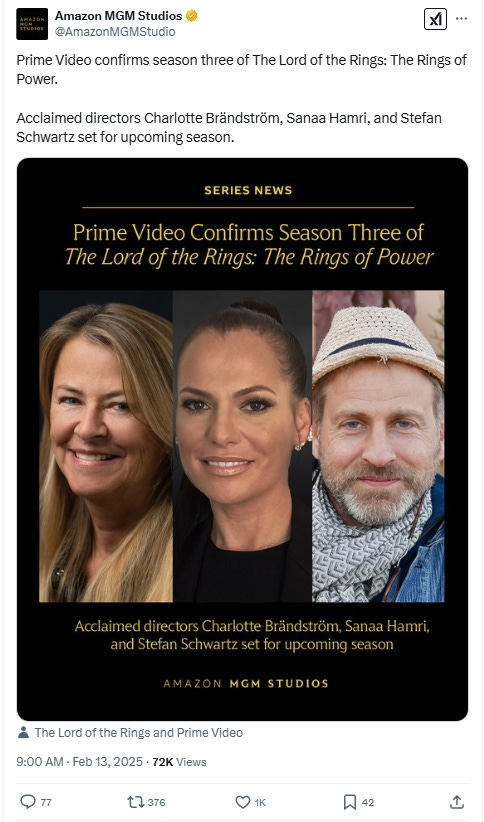 Amazon did renew the show for a third season in February. It announced, “Prime Video confirms season three of The Lord of the Rings: The Rings of Power. Acclaimed directors Charlotte Brändström, Sanaa Hamri, and Stefan Schwartz set for upcoming season.”