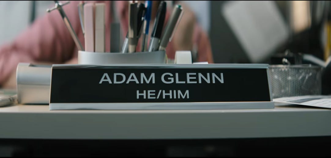 However, while on Earth, Adam is humiliated. He’s working a dead end job where he has pronouns listed on his nametag. Additionally, his boss appears to be a bald black woman who lectures him on his obsession with “nerd things” and says it’s not a good look for a human resources employee.