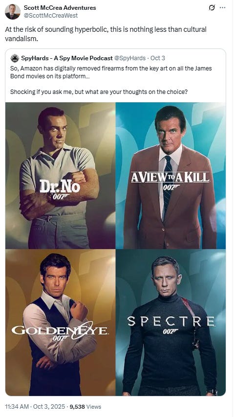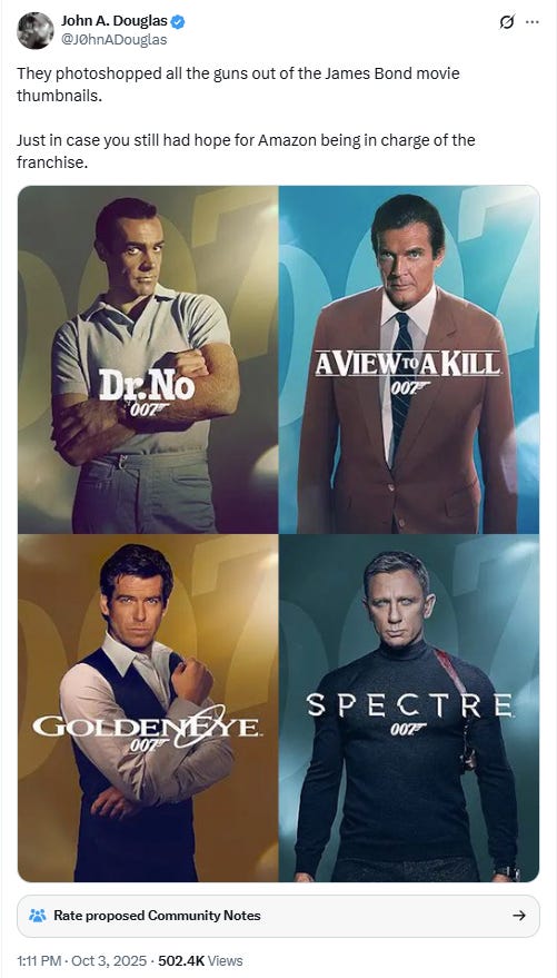 On October 2nd, James Bond fane site MI6-HQ.com discovered that Amazon Prime Video added new gunless thumbnails to its James Bond films. They digitally removed the guns from the Dr. No poster and GoldenEye images, elongated Bond’s arms in A View to A Kill so the firearm was cropped out, and shortened the holster in Spectre.