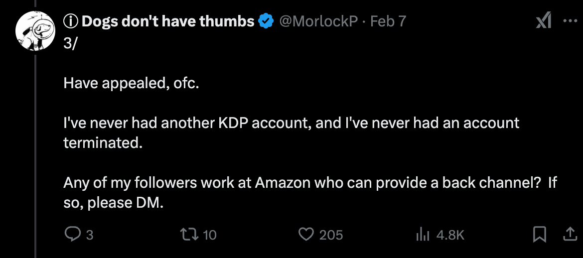 He posted to X, letting readers know he’s appealed, saying, “Have appealed, ofc. I've never had another KDP account, and I've never had an account terminated. Any of my followers work at Amazon who can provide a back channel? If so, please DM.”
