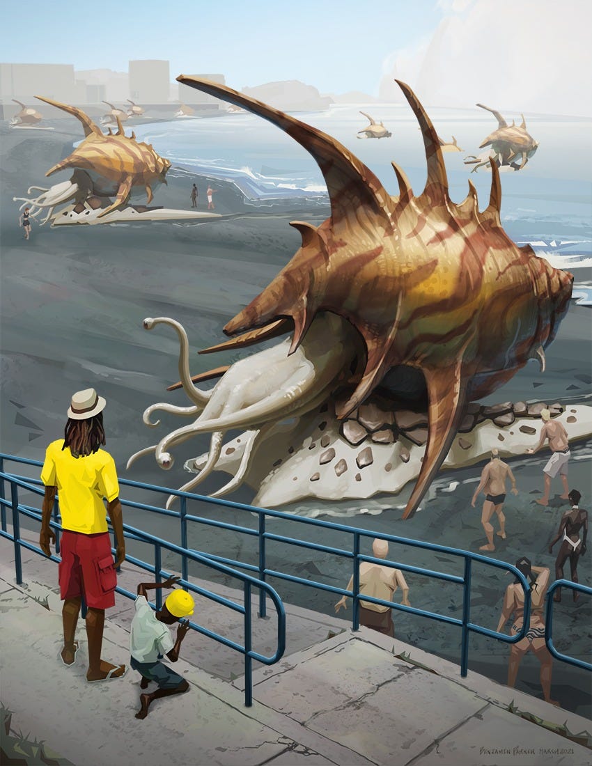 The first incitement comes in the form of massive snails that crawl aboard the shore of coastal cities–inducing panic and awe for these alien creatures. Throughout the book, we’re introduced to some of the mainstays in the alien sealife’s ranks. (They are dubbed The Fish for short). Crabs, Frogs, and the imposing leader caste of the Fish, known as the “Bosses.”