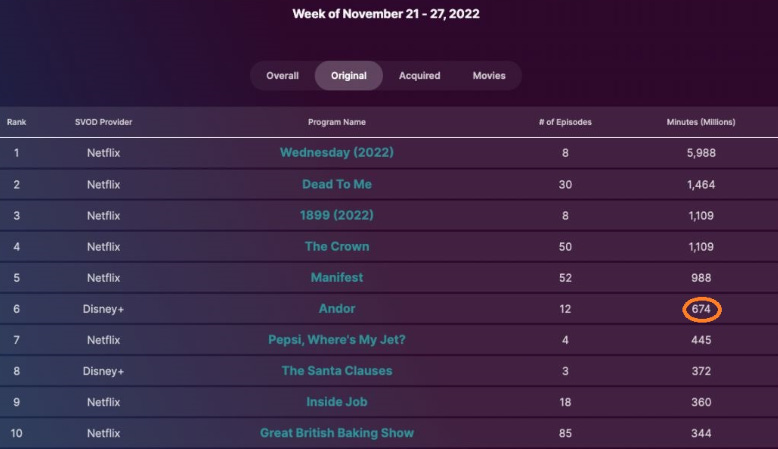 The Andor Season 1 finale only attracted 674 million minutes the week it premiered in November 2022 according to Nielsen.