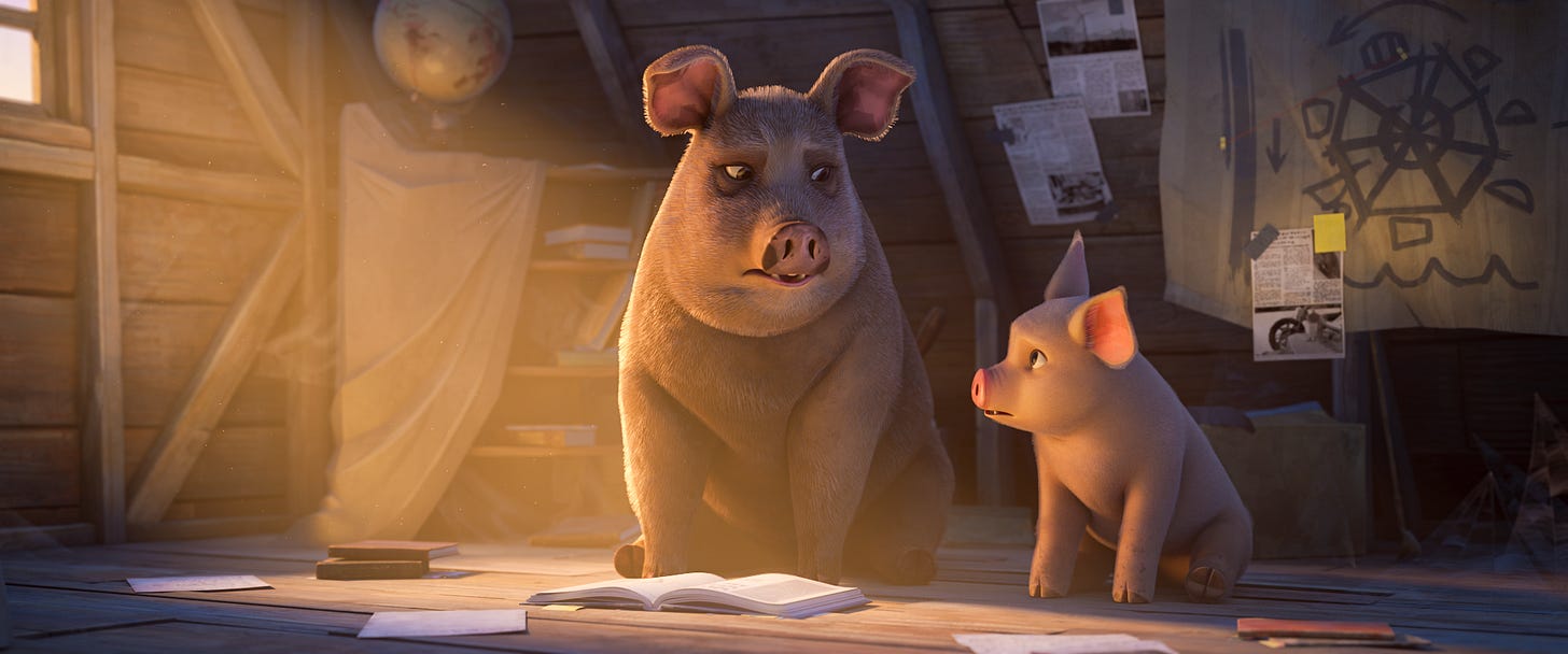 The voice work is solid across the board. The standout is the subtle romance subplot between two of the pigs once Lucky realizes Napoleon has been manipulating him. It shouldn’t work as wholesome moments showing forgivness and love in a movie with fart jokes, but it does. It’s definitely something outside the book but the tender moment with Lucky rubbing noses with the pig he truly loves is a cute one.