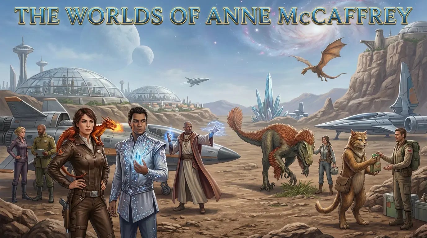 Most readers discover Anne McCaffrey through the Dragonriders of Pern. It’s one of science fiction and fantasy’s most beloved settings, and it’s where the majority of her readership begins and ends. What those readers often don’t realize is that Pern exists within a much larger framework, a shared universe called the Federated Sentient Planets that connects almost everything McCaffrey ever wrote.