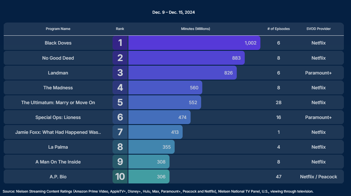In its second week, Nielsen reported the show had 370 million minutes watched.