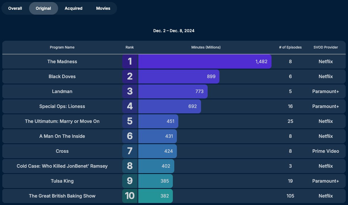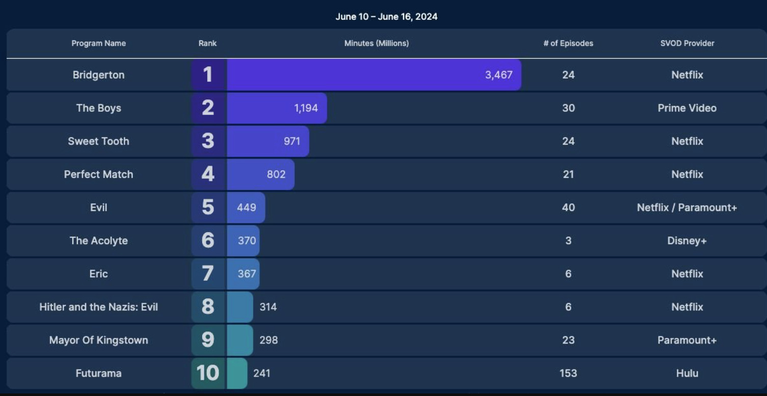 In its first week, which, again, had a two-episode premiere, it performed worse than Peacock’s The Day of the Jackal, which was the 10th performing show and only brought in 332.3 million minutes viewed.