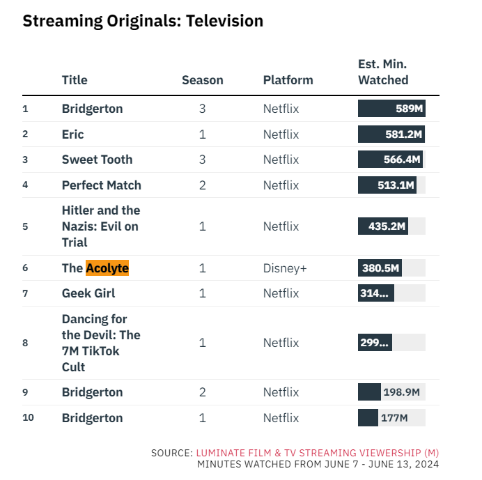 The Acolyte brought in 210 million minutes watched according to Luminate in its first week when it had its two-episode premiere back at the beginning of June. That was good enough for 9th on Luminate’s chart for the week.