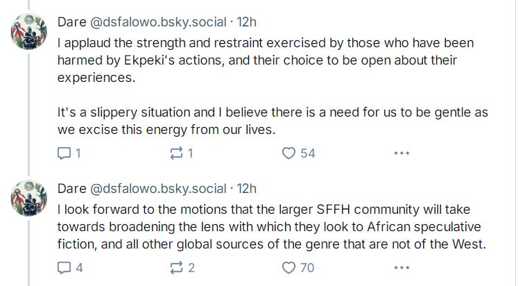 Ekpeki’s cancelation appears to be in full effect, having not posted to BlueSky in sixteen days as of this writing, nor X since October 23rd. His last BlueSky post was one complaining about how he couldn’t afford a master class by Fantasy and Science Fiction’s editor for a writing residency in Mexico. Even before he was shunned by SFWA’s elite, it’s clear that these diversity fiction markets don’t pay in anything but clout.
