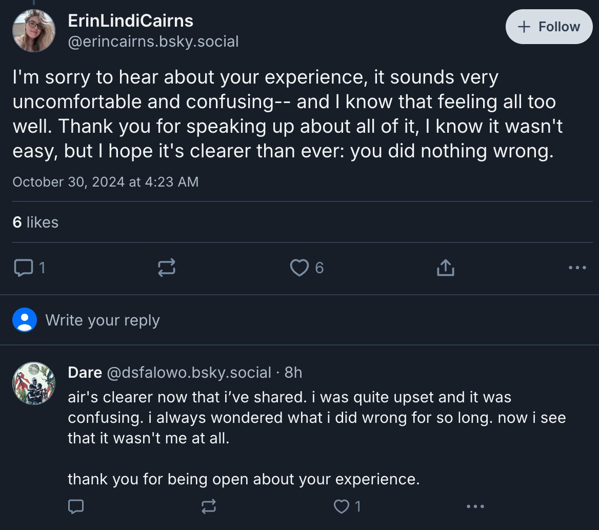 The original whistleblower on the Nigerian author chimed in to say, “I'm sorry to hear about your experience, it sounds very uncomfortable and confusing-- and I know that feeling all too well. Thank you for speaking up about all of it, I know it wasn't easy, but I hope it's clearer than ever: you did nothing wrong.”