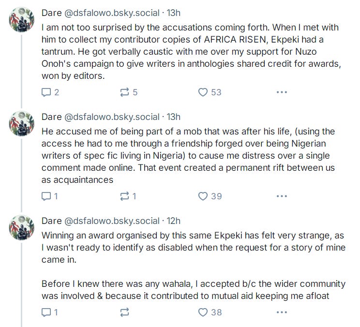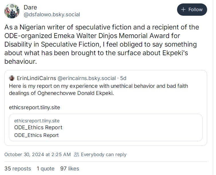Dare Segun Falowo posted to the liberal echo chamber BlueSky to his 131 followers to try to capitalize on the situation, “As a Nigerian writer of speculative fiction and a recipient of the ODE-organized Emeka Walter Dinjos Memorial Award for Disability in Speculative Fiction, I feel obliged to say something about what has been brought to the surface about Ekpeki's behaviour.”