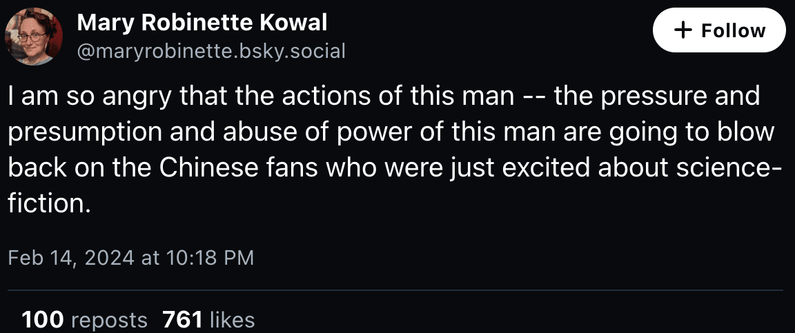 Former SFWA president Mary Robinette Kowal said of him at the time, “I am so angry that the actions of this man — the pressure and presumption and abuse of power of this man are going to blow back on the Chinese fans who were just excited about science-fiction.”