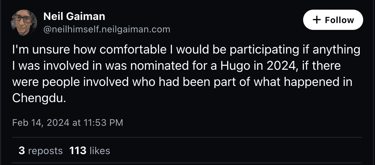 Alleged sex predator Neil Gaiman threw a particular fit about the situation. He took to the woke safe space BlueSky to post at the time, “I’m unsure how comfortable I would be participating if anything I was involved in was nominated for a Hugo in 2024 if there were people involved who had been part of what happened in Chengdu.”